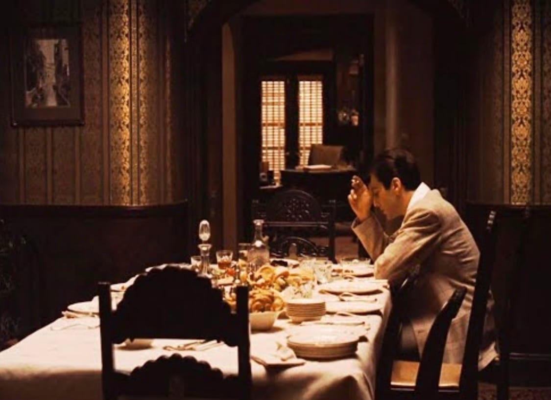 So, just to break this down: Fredo Corleone (John Cazale, 1935–1978) leaves first, followed by Sonny Corleone (James Caan, 1940–2022), then Tom Hagen (Robert Duvall, 1931–2026), leaving only Michael Corleone (Al Pacino) alone at the table.