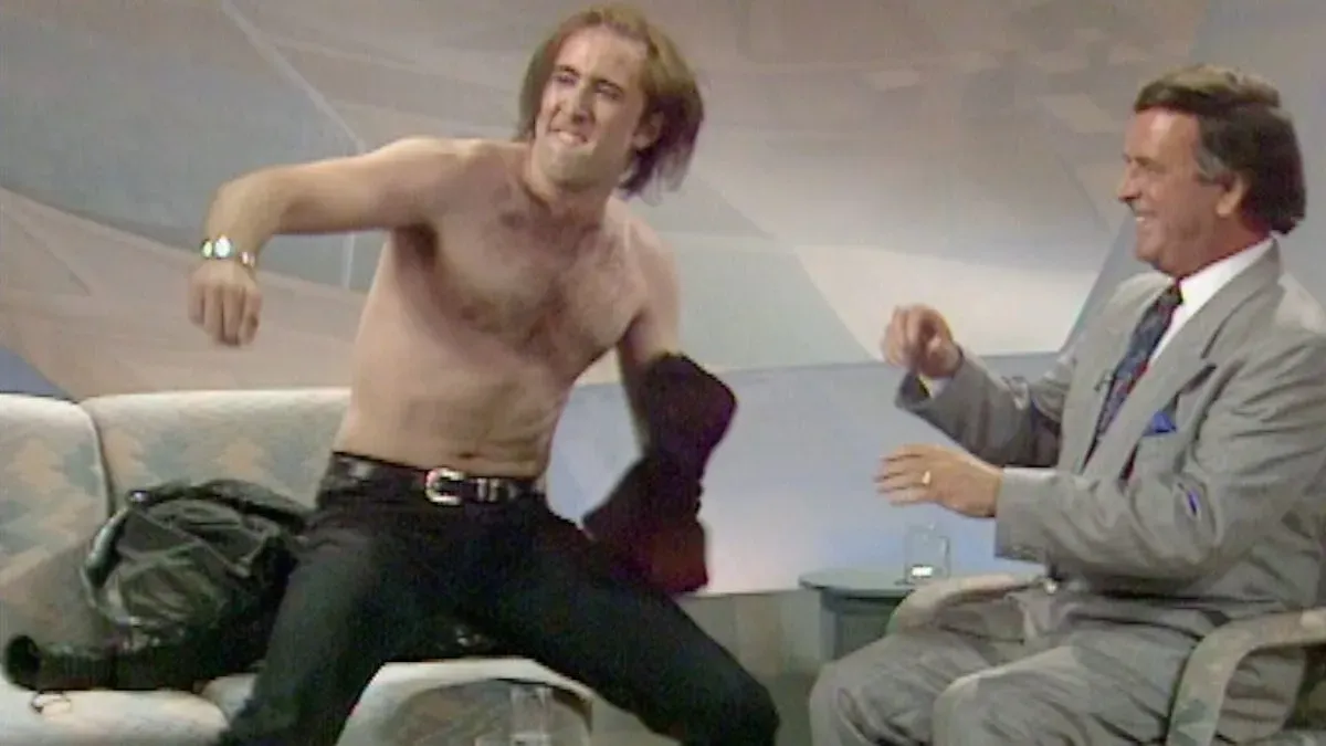 What inspired this fantasy of mine? Only one of my favourite interviews on YouTube, which I often return to as a pick-me-up: Cage arrives before an enthusiastic television audience, performing an inelegant front flip before yanking wads of cash out of his tight black jeans and hurling them at the crowd like a crazed rock ’n’ roll star. Because let’s face it, that’s what Cage has always really been. Actually, I would love for Nic Cage to have had his own metal band—he surely would have been one of the great frontmen of all time. Could have called his group Cage’Rage or Encaged.