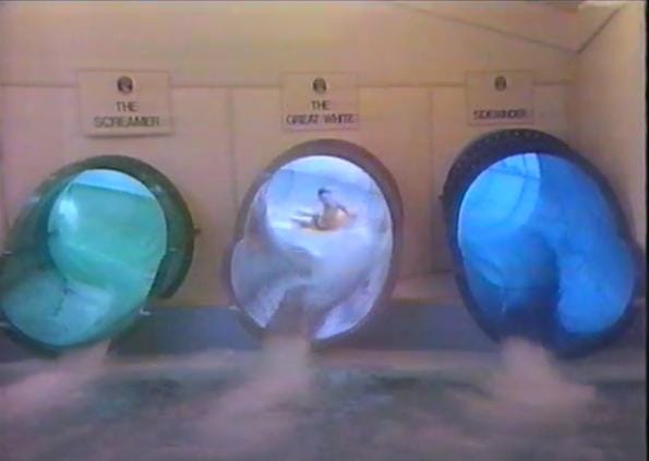 I can confirm from my own experience that there was a genuine sense of facing your fears, real and imagined, all on your own as you entered those green, white, and blue watery portals, otherwise known as Domebusters, hoping you’d come through the other side without getting stuck or thwacked in the back by someone sliding into you. Even worse was getting snagged on those unforgiving rivets in the fibreglass sections of the slides themselves. One of the slides (I don’t remember which) used to pause the flow of water momentarily, leaving you anxious about whether it would return before a final swoosh sent you down through the chutes into the big pool—a kind of instant rebirth—where you were greeted by ecstatic fellow survivors of the experience.